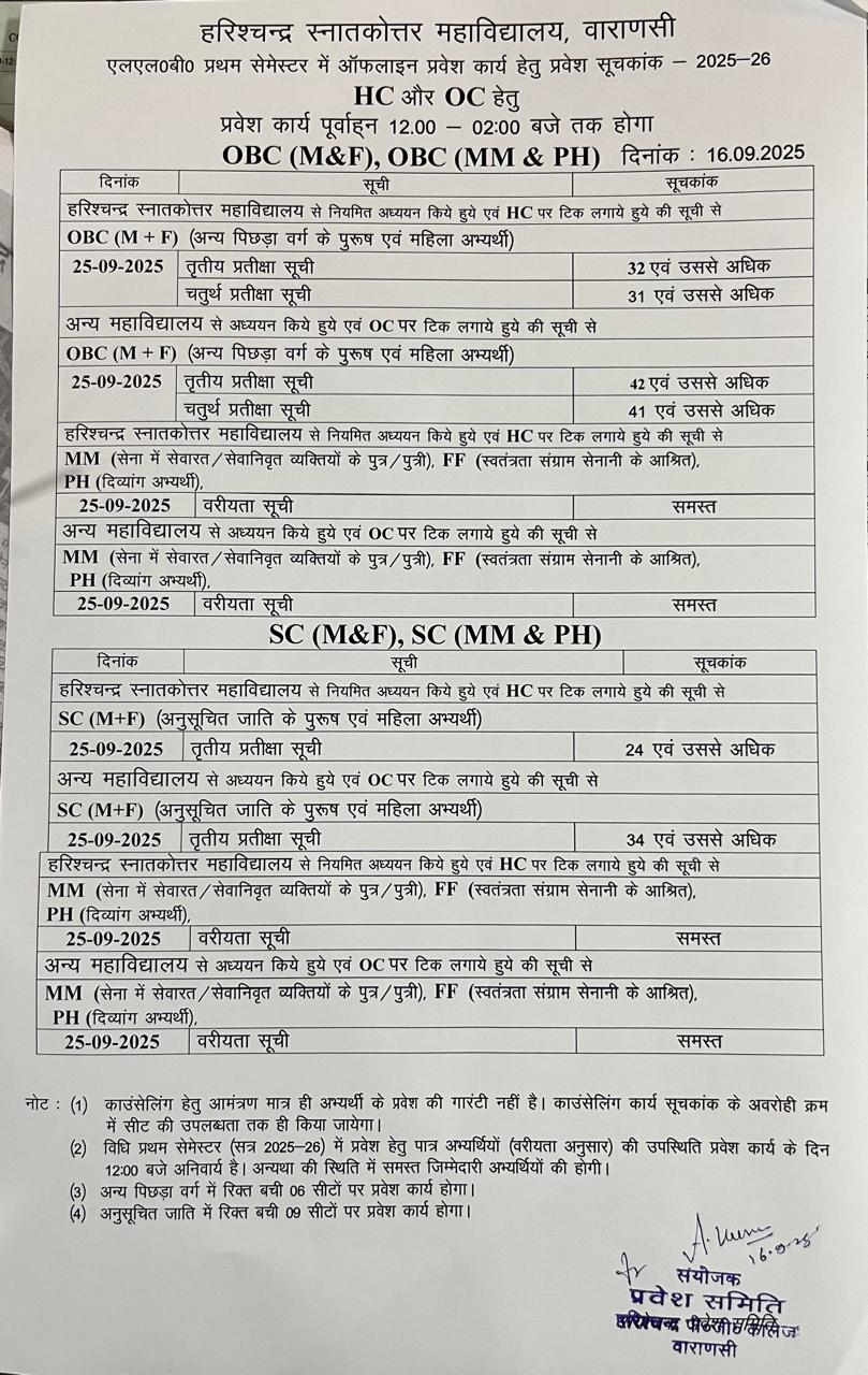 एल-एल०बी० प्रवेश सूचकांक (दिनांक 25/09/2025 हेतु)